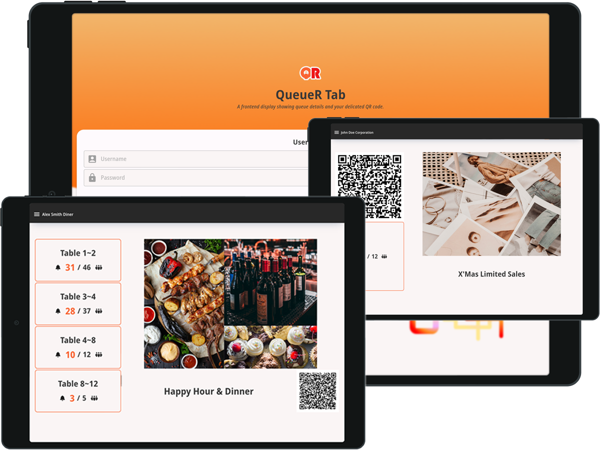 QueueR-Tab offers dynamic QR codes to prevent customer misuse by minimizing internet sharing and queue overcrowding. Queue counters are automatically updated online for real-time accuracy. Our flexible design accommodates various tablet devices, computer monitors, and televisions for seamless integration into your environment.